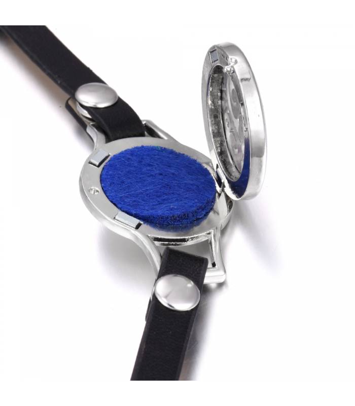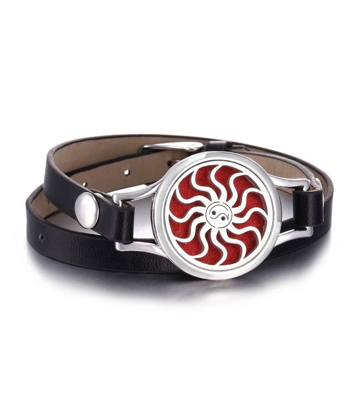 Puošni, 2 kartus apie rieša apsisukanti apyrankė su eterinių aliejų medalionu su nerūdijančio plieno apdaila ir odiniu dirželiu. Ši apyrankė pagaminta iš aukštos kokybės, hipoalerginių medžiagų.